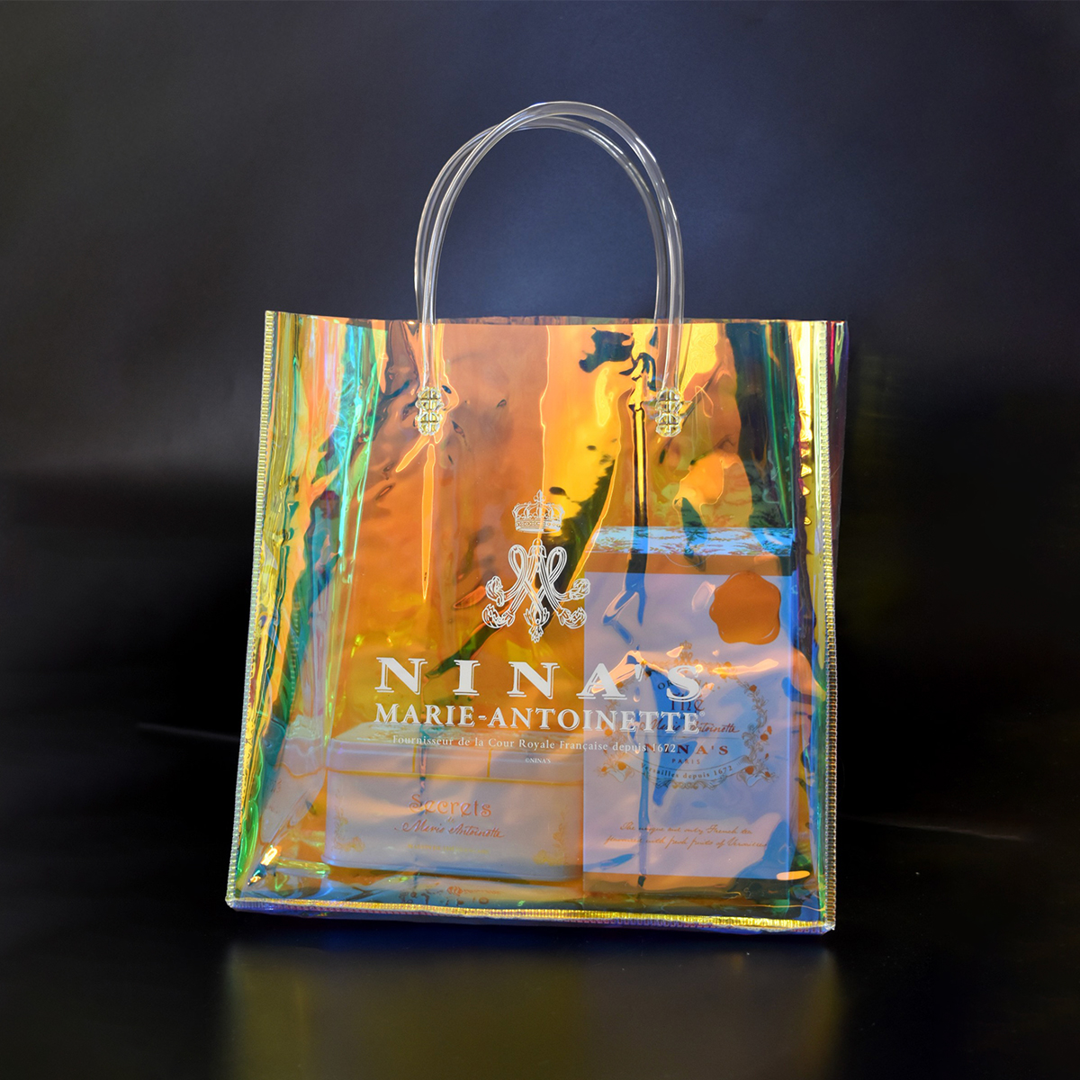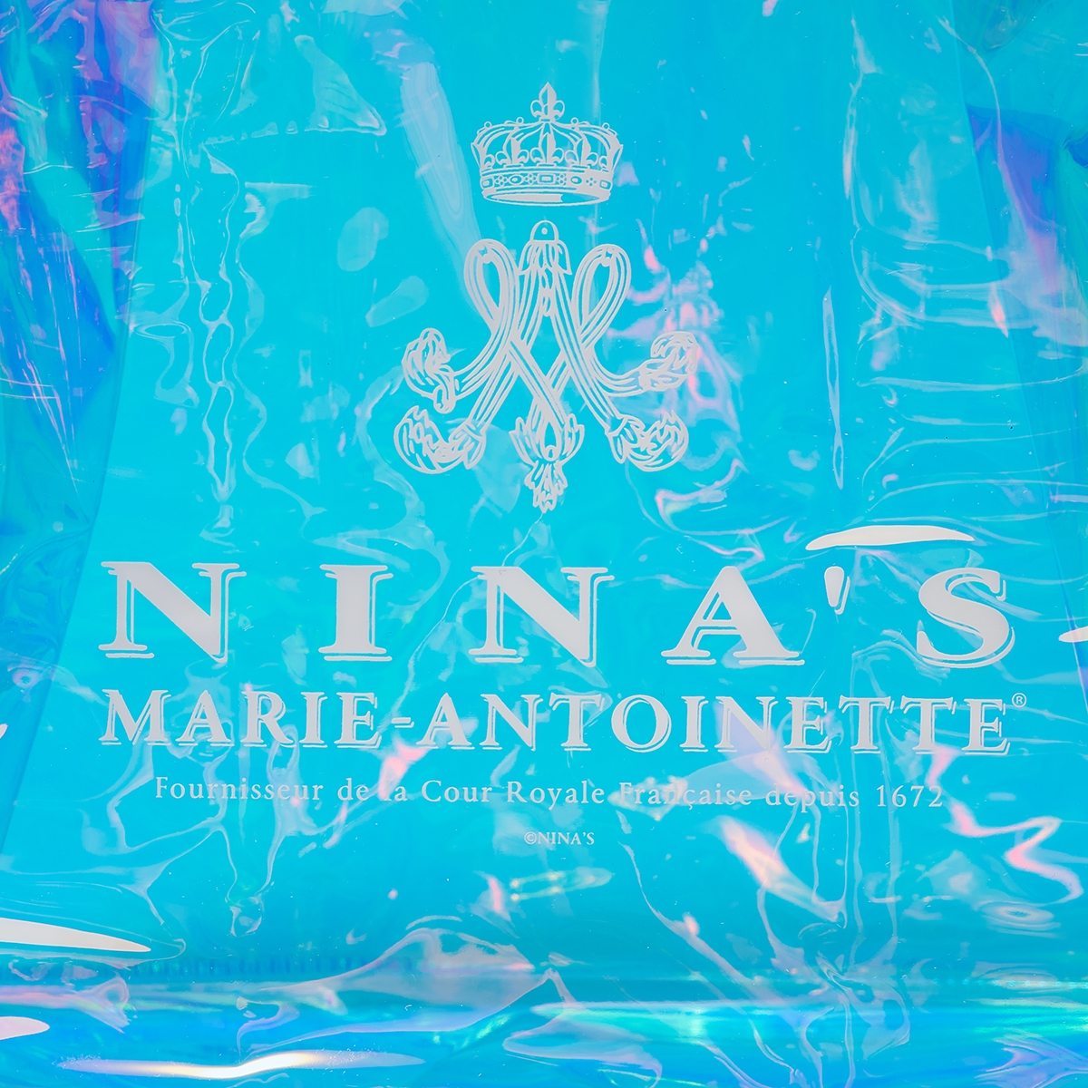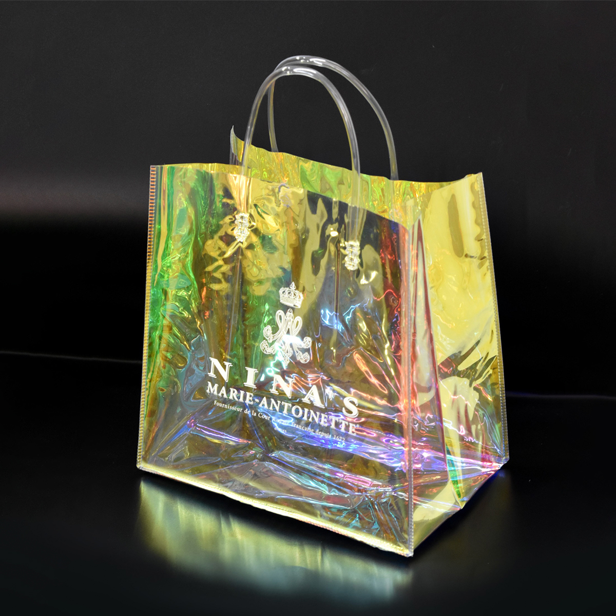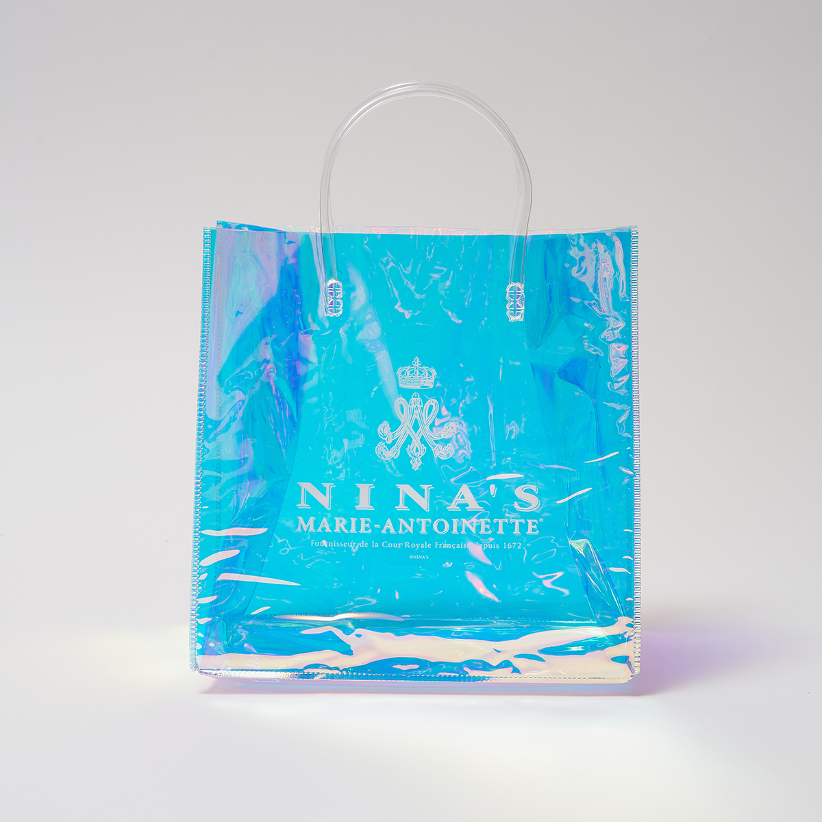 ニナスのオリジナルロゴをあしらった、オーロラカラーに輝くエレガントなクリアバッグです。